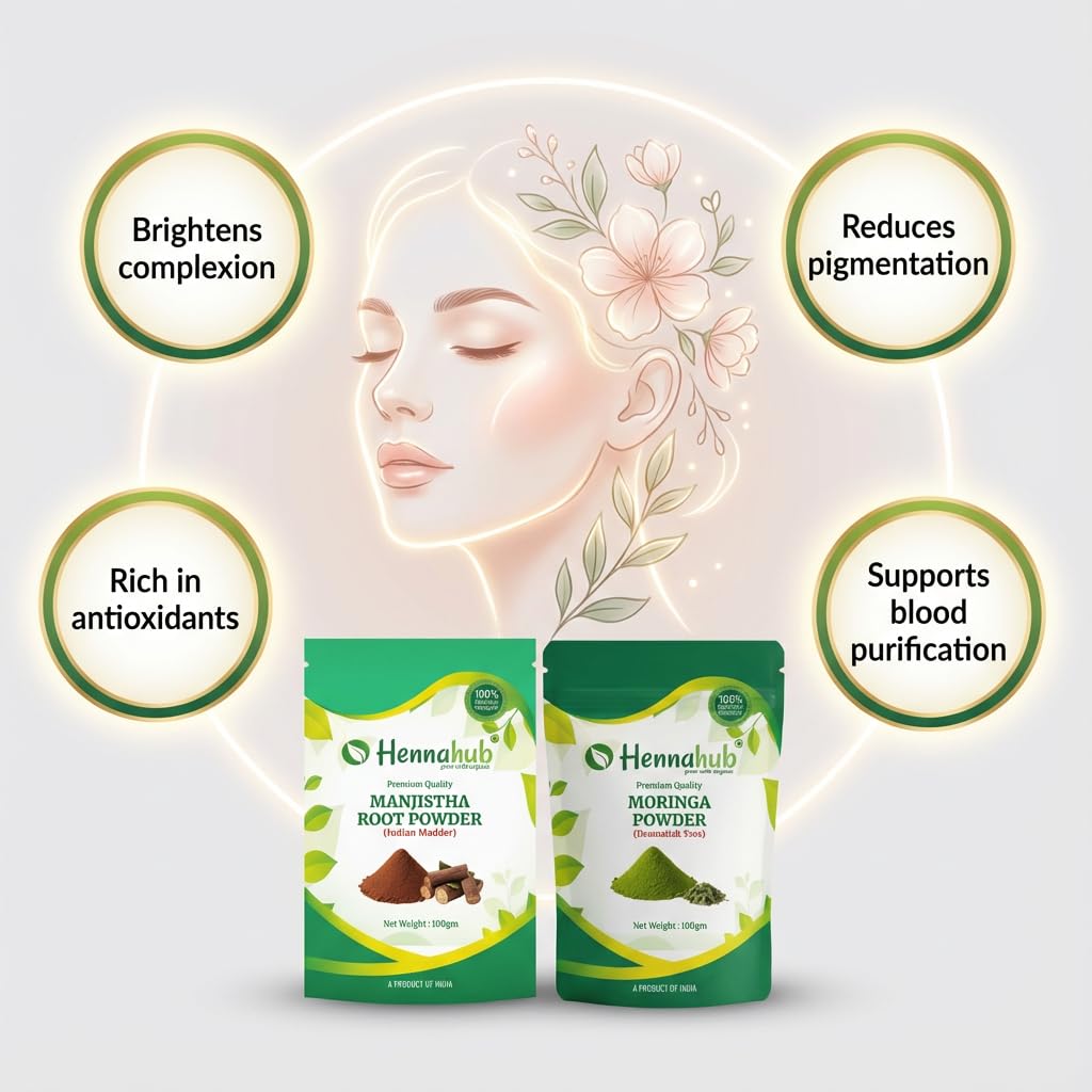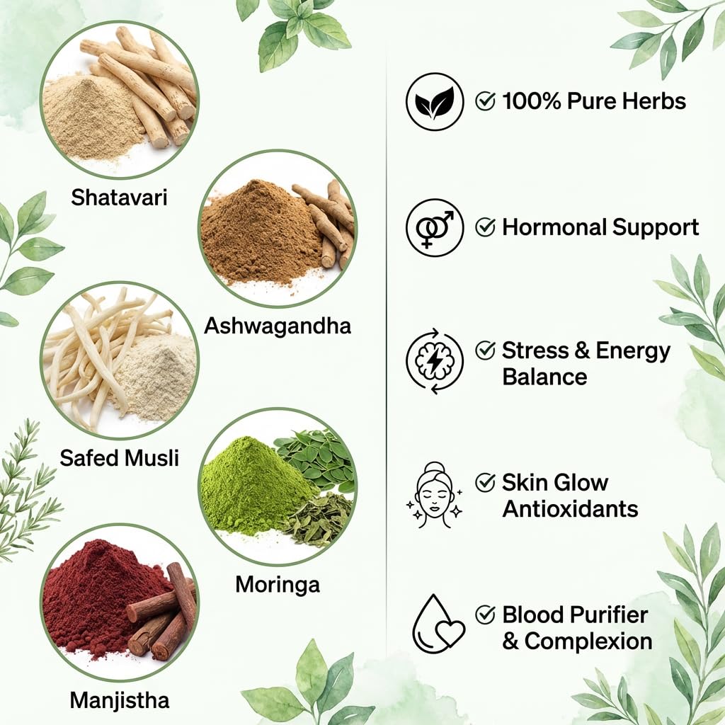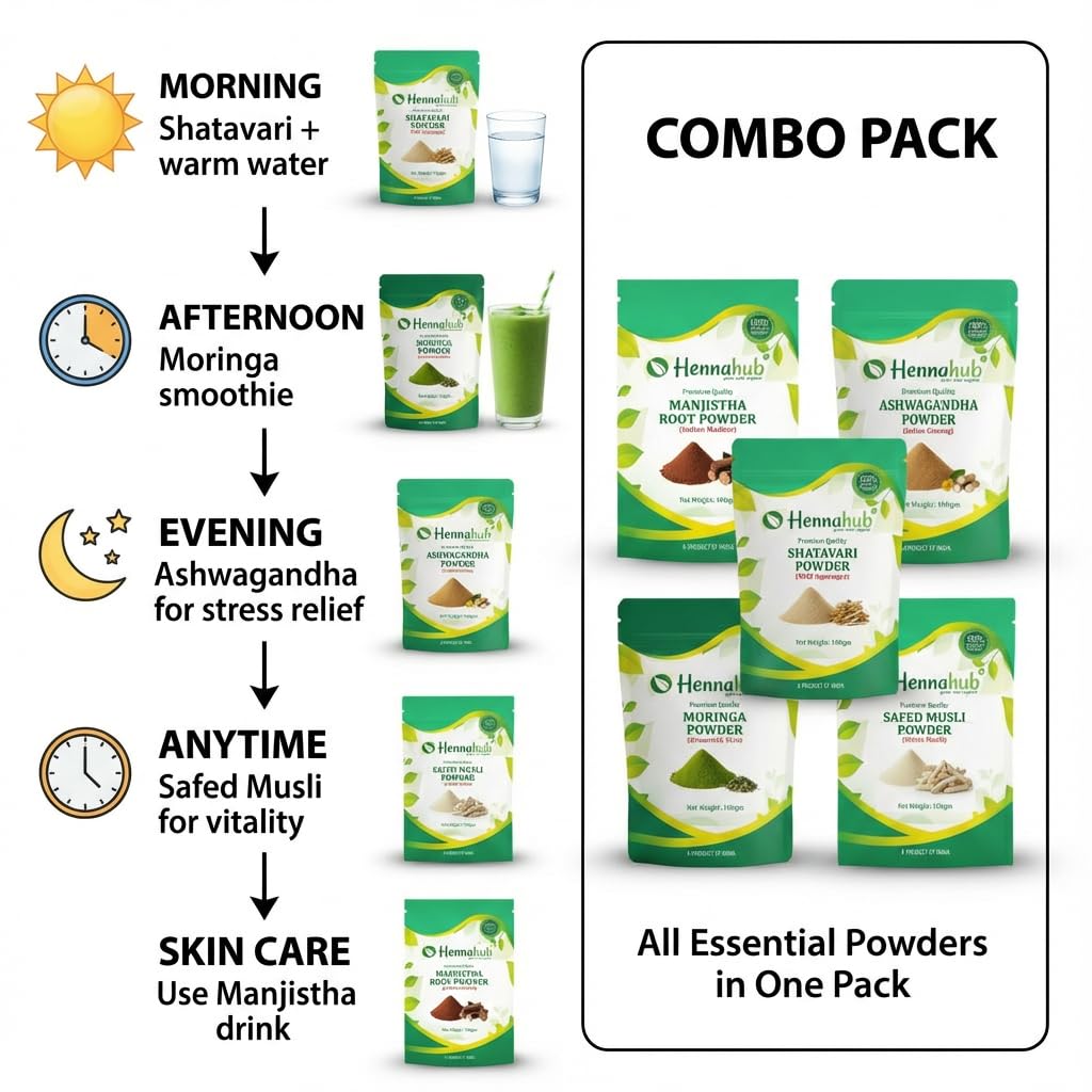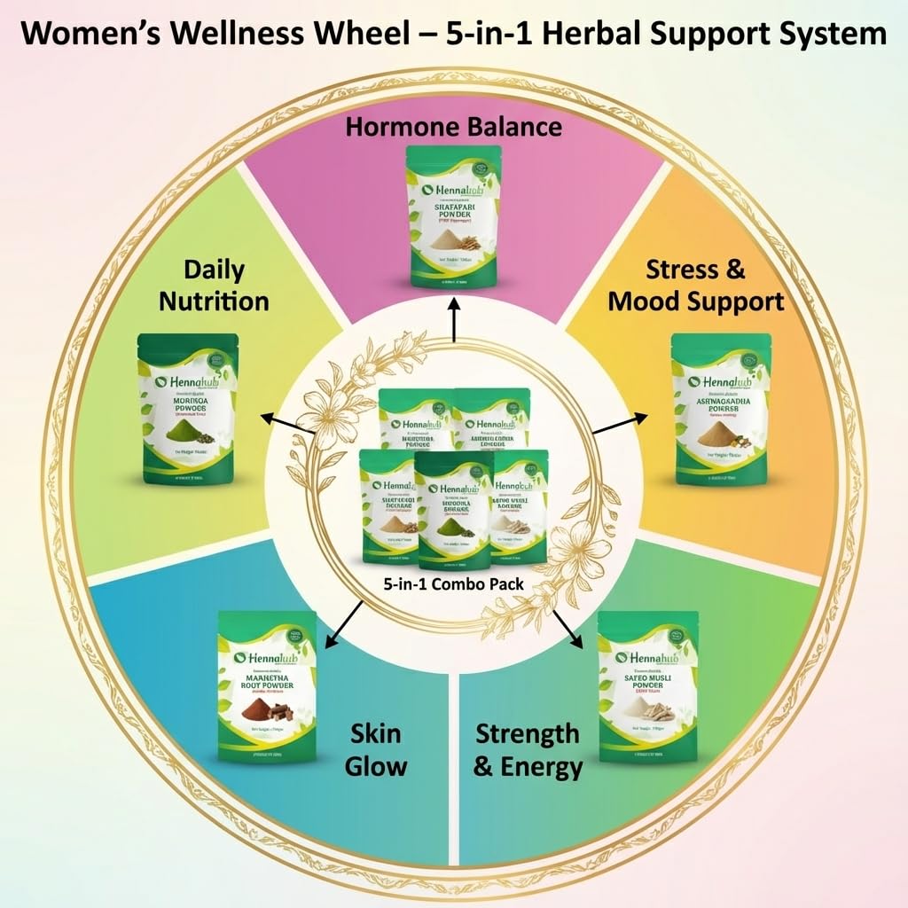 The Hennahub Women's Complete Wellness Combo brings together five powerful Ayurvedic herbs designed to nourish a woman's body from within. This premium pack includes Shatavari, Ashwagandha, Safed Musli, Moringa and Manjistha — all known for their unique roles in supporting hormones, skin health, energy, immunity and emotional balance.